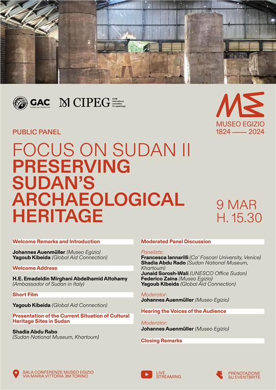 On March 9, 2026 at 3:30 PM (CET), the international roundtable “Focus on Sudan II – Preserving Sudan’s Archaeological Heritage” will take place in our conference hall. The event is organized by the Museo Egizio in collaboration with Global Aid Connection (GAC) and the International Committee for Egyptology (CIPEG).